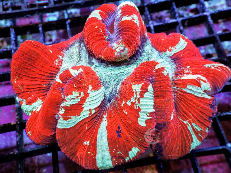 Trachyphyllia corals (commonly called open brain corals) are large-polyp stony (LPS) corals known for their vibrant colors and fleshy, dome-like or open “brain” structure. They often display striking patterns in shades of green, red, pink, and multicolor combinations, making them a standout centerpiece in reef aquariums. Their large, fleshy polyps and flowing appearance give them a soft, dynamic look when fully expanded. The meaty part of the coral tissue will swell with water many times the size of their skeleton, often to the point of swaying in a gentle flow.