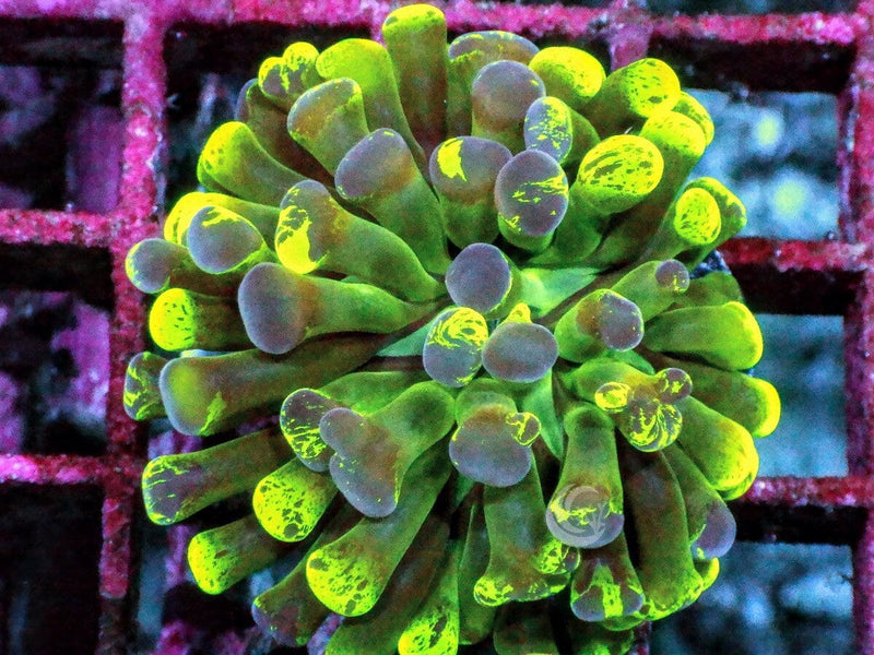 Hammer corals are easy to keep and do best with moderate levels of mostly blue LED lighting. They require gentle water flow to cause slight swaying of their tentacles. Stronger direct flow will damage their delicate tissue. Their tentacles extend many inches beyond their honeycomb type hard calcified skeleton. Hammers are aggressive and extend sweeper tentacles that will sting nearby corals. To prevent damage to other hard corals give Hammer corals several inches of space. Direct feeding is not necessary, but they will grab and eat any food that contacts their tentacles. Their tentacles retract at night.