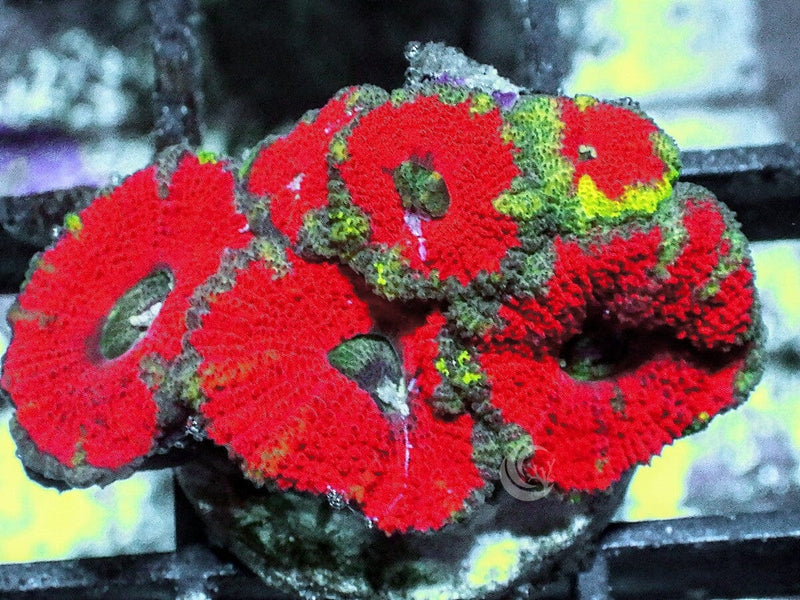 Acans have some amazing color combinations and many hobbyists like to put different color frags together to form Acan gardens. Acans are very easy to keep and appropriate for most reef aquariums. They reproduce by forming small buds of new polyps at the base. When mounting new frags leave enough room around the base so that new polyps can grow.