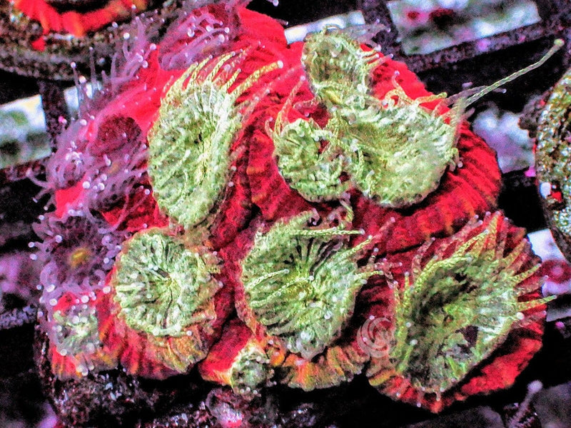Brain corals include a rainbow of colors. For example, there are dozens of color varieties of Favias from Flaming red to glowing green.