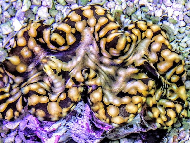 Please note that clam coloration naturally varies depending upon the angle of viewing. This is an optical effect and not an actual change in color. Our clams are photographed from the top down. We use a digital camera to photograph our clams. Certain colors are difficult for the camera to capture, such as variations of blue. We try to represent our clams as accurately as possible given the limitations of digital technology. Clams may look different in your tank due to lighting and angle.