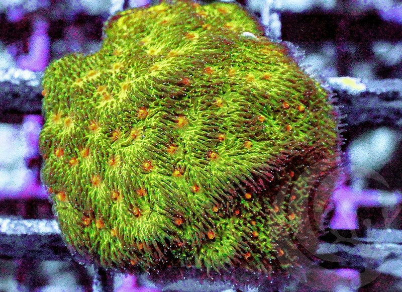 This Pumpkin Patch Psammacora is"WYSIWYG" - What you see is what you get - so this one is yours! This is grown on our farm and is a Dr. Mac Stash coral. We have a wide variety of corals all grown in our facility.